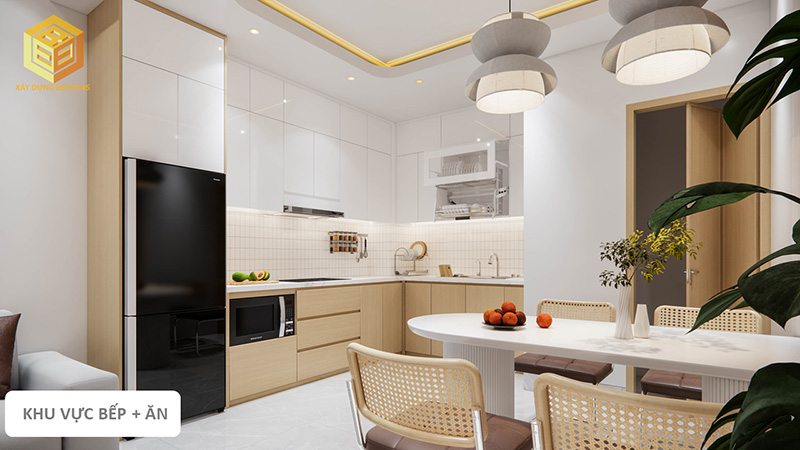 Phòng bếp được thiết kế theo phong cách tối giản nhưng đầy đủ tiện nghi, với hệ tủ bếp cao sát trần, tối ưu không gian lưu trữ. Bàn ăn hiện đại với ghế đệm êm ái, đèn thả trang trí tạo điểm nhấn ấm cúng, phù hợp cho những bữa cơm gia đình ấm áp.